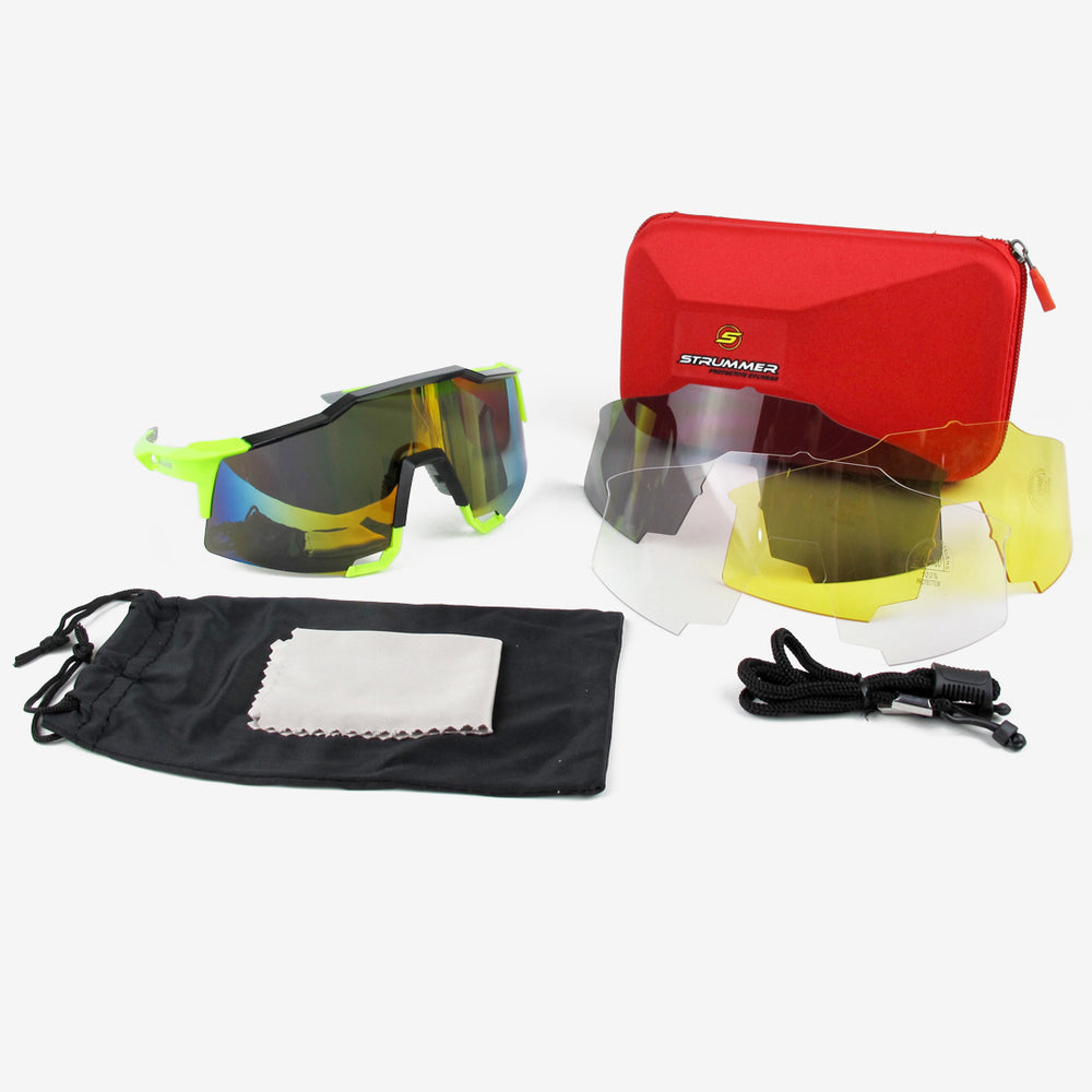 แว่นตา Strummer GS-001 มาพร้อมเลนส์เปลี่ยนได้ 3 ชิ้น ผ้าไมโครไฟเบอร์ ถุงผ้าแบบนุ่ม และสายคล้อง รวมกันอยู่ในกล่องเดียวเพื่อการจัดเก็บและการเดินทางที่สะดวก